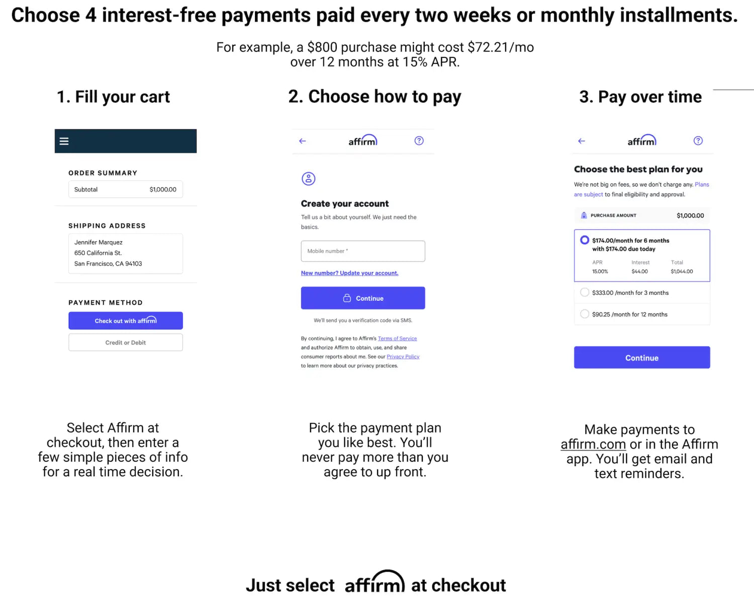 You can make or schedule payments at affirm.com or in the Affirm app for iOS or Android. Affirm will send you email and text reminders before payments are due.